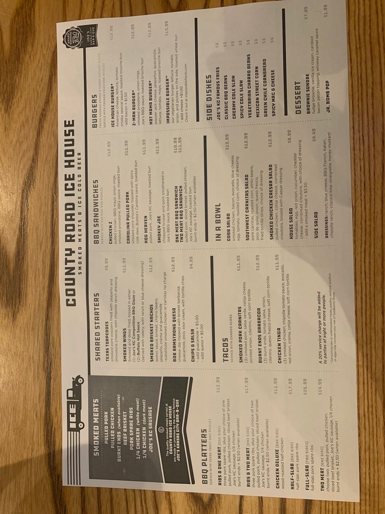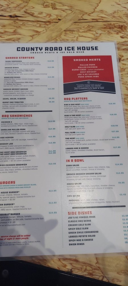 County Road Ice House, located in the heart of Kansas City, serves up a delightful array of American cuisine with a focus on barbecue. With a menu that highlights items like the mouthwatering Ice House Burger and their renowned BBQ platters, this eatery promises a satisfying experience for both meat lovers and vegetarians alike. The Impossible Burger stands out as a fantastic veggie option, while the various meats, including tender ribs, cater to traditional tastes.
